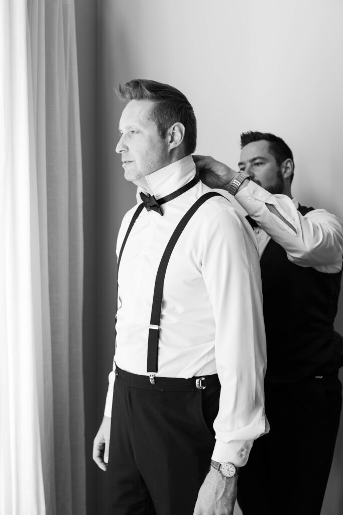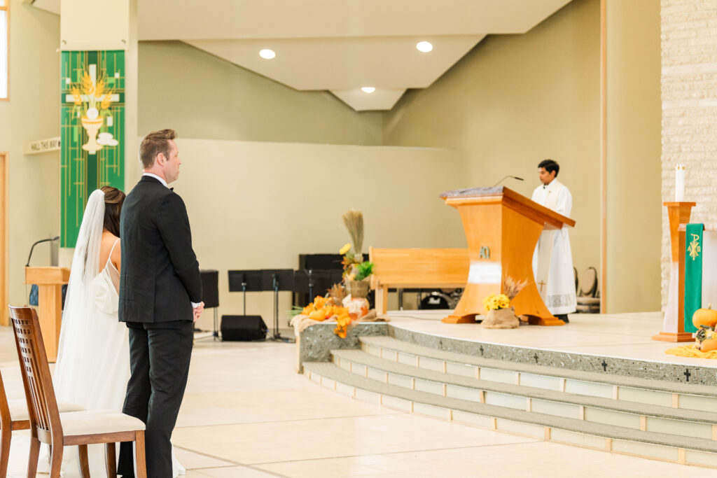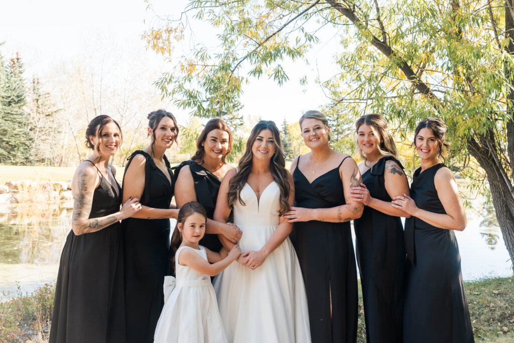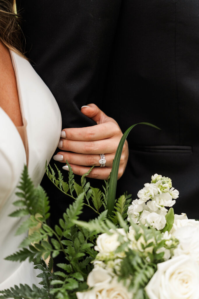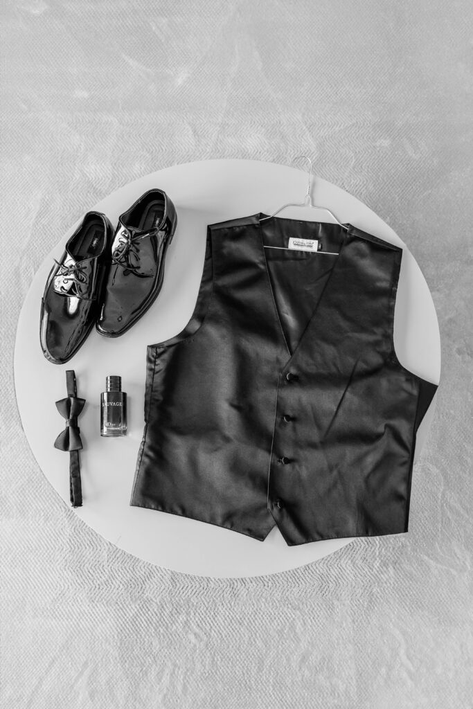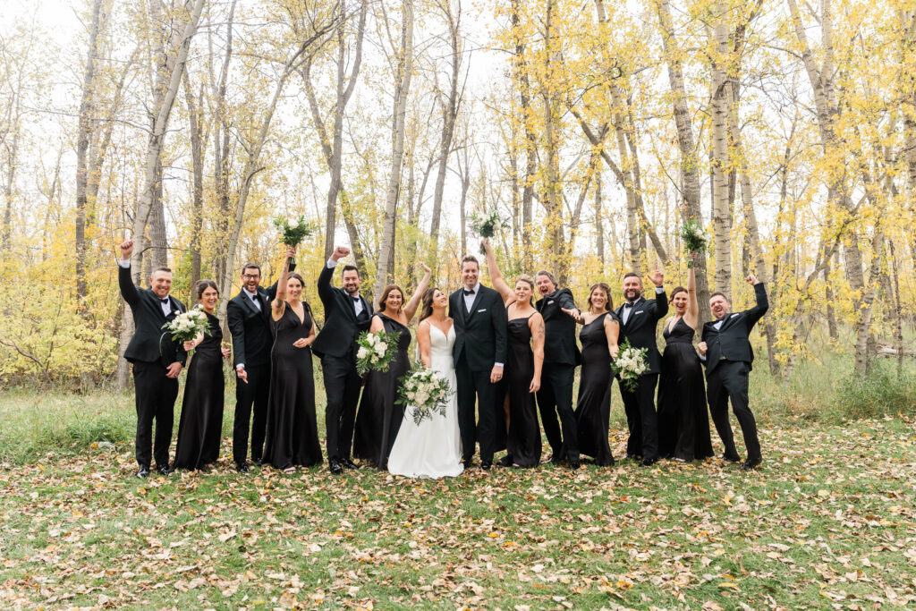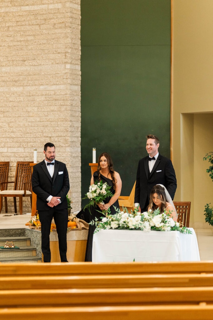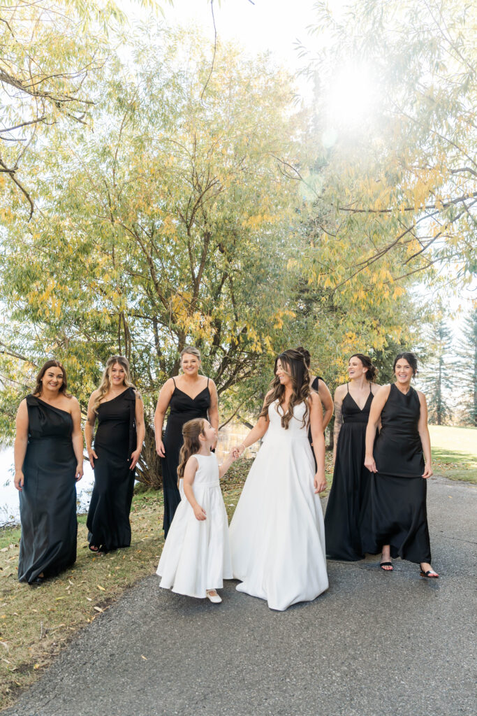 Their wedding day felt like a fairytale from beginning to end. It was the last day of fall — golden leaves still clinging to the trees, and by evening, a gentle snowfall arrived, wrapping everything in winter beauty. They exchanged vows at St. James Parish before heading to Crystal Ridge Golf Club for an unforgettable celebration filled with love, laughter, and the most elegant black-and-white details.